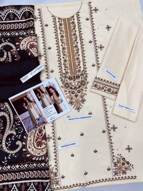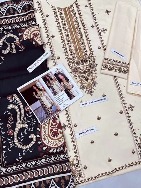 👉 You’ll receive a 3-piece unstitched suit — Embroidered front, embroidered sleeves, dyed back, and a digital printed wool shawl.