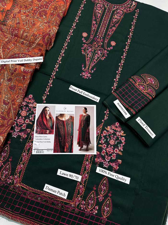Heavy embroidery on premium lawn fabric, featuring elegant motifs inspired by modern luxury fashion.