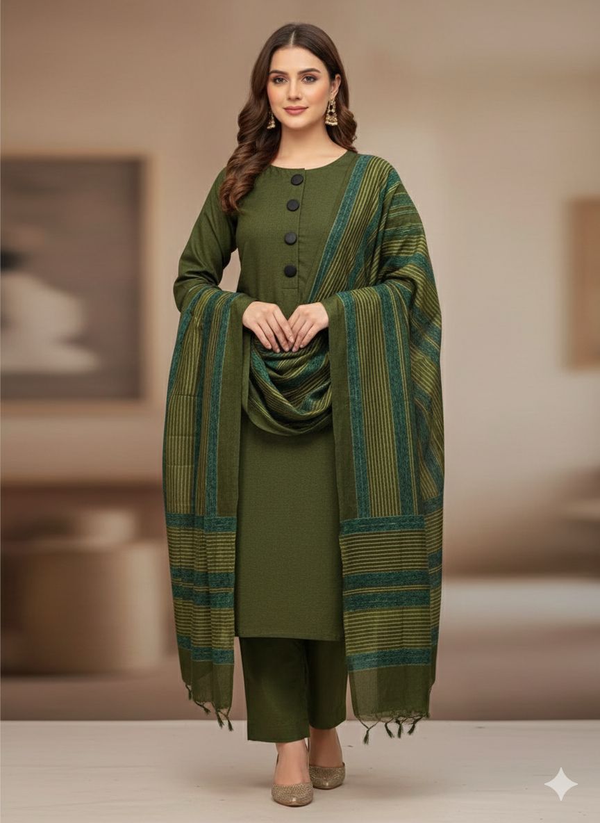 The Khaddi Susi shirt carries a refined winter print that feels soft on the skin and provides comfortable insulation during colder days. Its breathable nature makes it ideal for extended wear, whether at home or outdoors. The look is completed with a Khaddi Susi dupatta enhanced with multi velvet strips, adding texture and seasonal richness without overpowering the design. A dyed Khaddi Susi trouser ensures visual harmony and allows flexible stitching options.