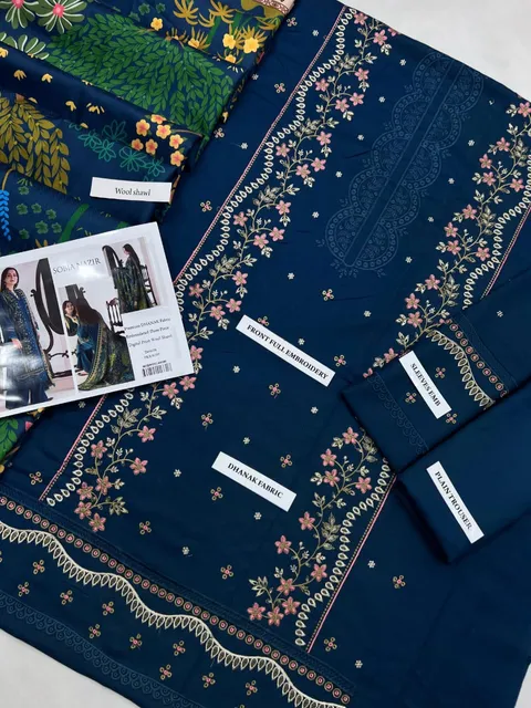 👉 A 3-piece set — embroidered shirt front & sleeves, plain back, digital printed wool shawl, and plain trouser.